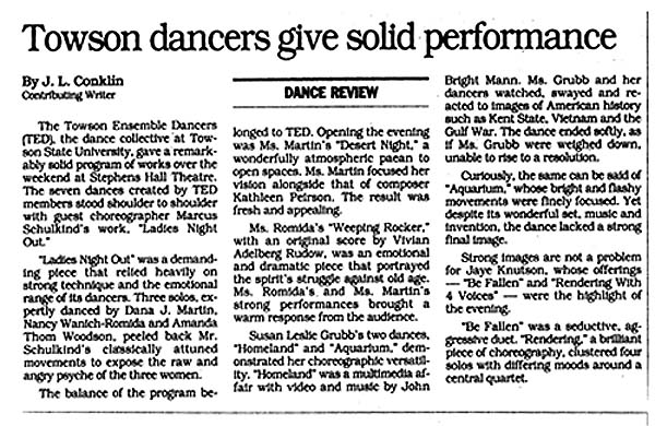Yes, Kathleen's work in music for dance is informed by her own extra-musical involvement in dance itself. Kathleen knows instinctively "what works," musically, for dance. Having choreographed and taught modern dance for several years herself (at Baltimore Actors Theater Conservatory, at Appel Arts Center, and for Performing Arts Collective), and having once founded and directed a succesful dance organization (Fayetteville's Performing Arts Collective), she has a deep appreciation of the varied perspectives of teachers, choreographers, and administrators.
